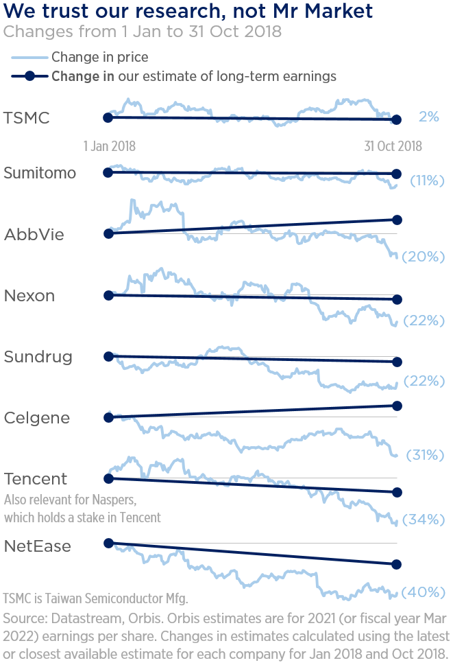 Earlier in the year, we believed all of these stocks were attractive (or they wouldn’t have been considered for the Funds). In some cases, such as Taiwan Semiconductor Manufacturing Company (TSMC), neither the price nor our estimates have really changed, so we continue to find them attractive. But Mr Market is volatile. He can become fearful even if a company looks the same – or better – to a long-term business owner. That’s clear for Japan-listed online game company Nexon and drugstore operator Sundrug, where our assessments are little changed, and for US biopharmaceutical companies AbbVie and Celgene, where our long-term estimates have risen but the companies’ prices have fallen. For Chinese technology companies NetEase and Tencent, we have adjusted our view of what the businesses will earn in four years, but Mr Market’s view has gone from tentative to downright despondent.