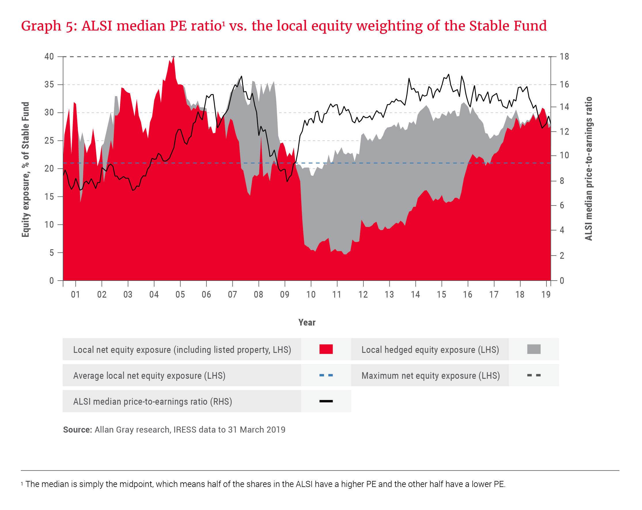 South African shares have performed no better than cash over the past five years – well below the average 8% per year historic outperformance. Similarly, emerging markets (including South Africa) have underperformed against developed markets and are out of favour with global money managers. It should therefore be no surprise that we are currently finding value in the local market. Graph 5 depicts the median price-to-earnings (PE) ratio of the constituents of the ALSI versus the local equity weighting. Unsurprisingly, as the median PE has declined, our equity weight has increased, and the hedged equity position has been reduced. Put differently, as the prices of our favoured shares move further below intrinsic value, the risk of permanent capital loss decreases and the benefit of being invested in equities subsequently increases.