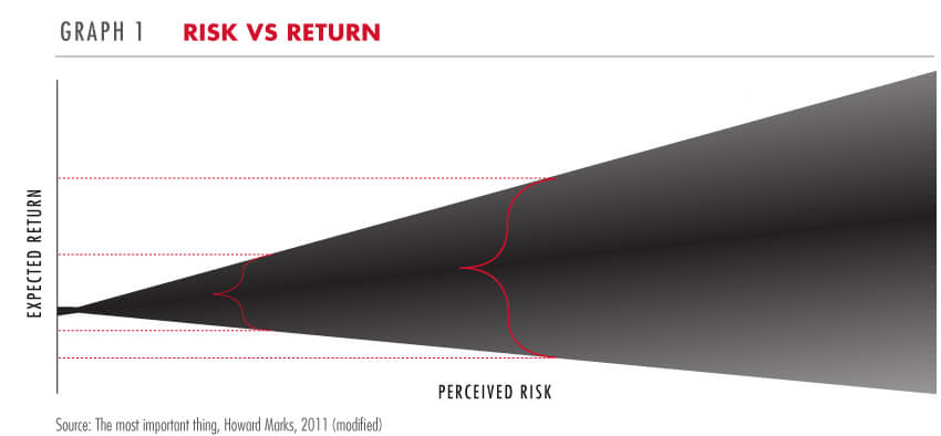 Unfortunately, in the real world, this simplified relationship does not exist. We have imperfect information, so we are forced to deal with perceived risk and expected return. And at any level of perceived risk, there is a range of potential outcomes, as shown in Graph 1. By definition, this range widens as the risk increases, making it progressively more challenging to predict outcomes with any certainty. Your actual return could be far higher or far lower than your expectations. Even with perfect information and analysis, taking on greater risk does not guarantee greater future returns.